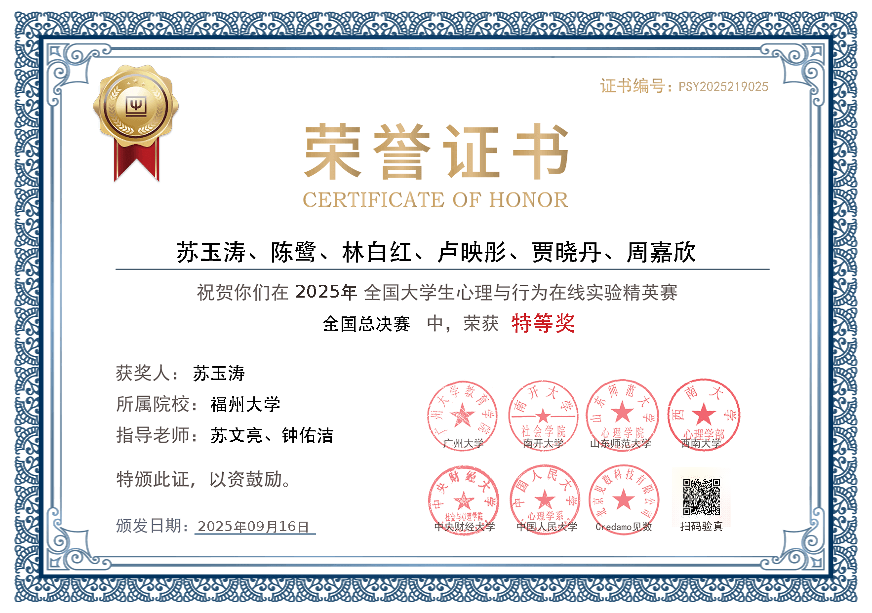 心理系2023级和2022级本科生苏玉涛、陈鹭、林白红、卢映彤、贾晓丹、周嘉欣组成的“神经元蹦迪组”,在苏文亮教授、钟佑洁副教授的全程指导下,历经六个月的系统备赛,在校赛、分赛区赛及全国总决赛中一路过关斩将,最终从全国323所高校的929支队伍中脱颖而出,勇夺全国总决赛特等奖!这是91国产