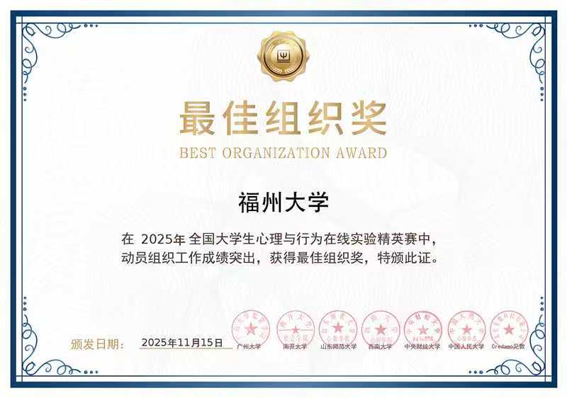 还荣获“最佳组织奖”奖项,苏文亮老师获评“年度十佳指导老师”,钟佑洁老师获评“优秀指导教师”,成绩斐然,充分展现了我校在心理学教学与实践创新方面的综合实力。